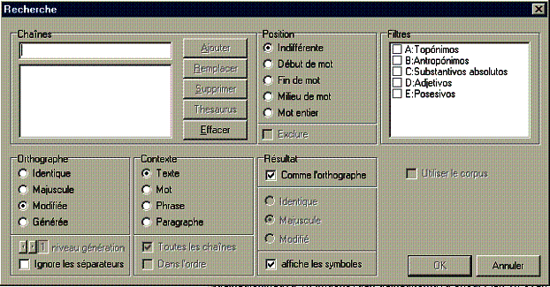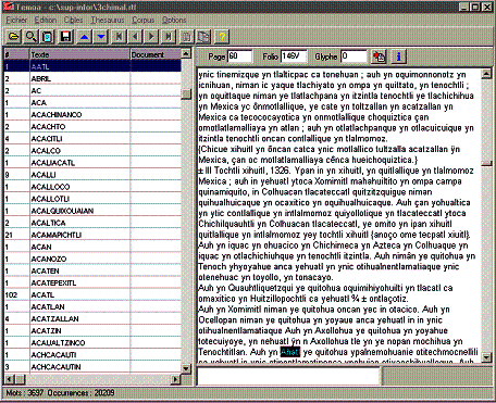tient compte du découpage réel des mots. L'option SANS ne tient pas compte des séparateurs et permet de trouver 'tlacaxipehualiztli' même s'il est écrit 'tlaca xipehualiztli'. |