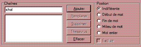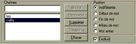 troisième position. Supposons que l'on recherche tous les mots comportant les chaînes 'michi' et 'iztac', mais seulement ceux qui comportent 'michi' avant 'iztac'. On coche alors l'option DANS L'ORDRE, puis on introduit comme première chaîne 'michi' et comme seconde 'iztac'. |
