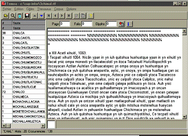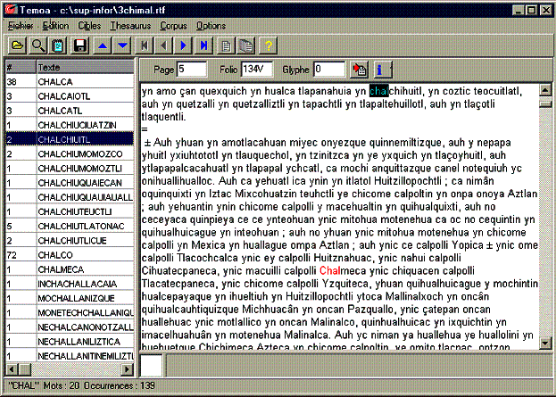 TEMOA (verbo náhuatl que significa : buscar) es un editor de texto trilingüe dotado de funciones avanzadas para la búsqueda de cadenas de caracteres. Este editor le permite buscar el número de cadenas deseado, especificando a su vez : la posición de cada una de estas cadenas, el contexto, la ortografía, si hay o no separadores, la manera de visualizar los resultados y los contextos, así como la exportación de los resultados. Las búsquedas podrán hacerse para un conjunto de textos constituídos en corpus y los objetos de la búsqueda podrán reagruparse en thésaurus. Para principiar con TEMOA tiene