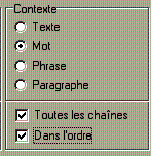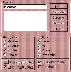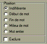 chacune spécifier l'emplacement à l'intérieur d'un mot. Il est possible de rechercher plusieurs mots qui se suivent en supprimant les blancs entre les mots et en cochant l'option <Ignore les séparateurs> (en bas à gauche) |