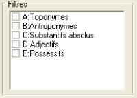 FILTRO Se puede especificar en qué tipo de palabras las cadenas de caracteres que se buscan pueden encontrarse y así filtrar la búsqueda. Estos filtros no pretenden ser totalmente eficaces si no sólo disminuir el ruido que ocacionan algunas búsquedas. TOPONIMOS : son considerados como suceptibles de ser topónimos todas las palabras que se terminan en co, an, la, lah, tech, o c. ANTROPONIMOS : todas las palabras terminadas por tzin. SUSTANTIVOS ABSOLUTOS : todas las palabras que se terminan en in, tl, li y los plurales me, a, ah. ADJETIVOS : todas las palabras que se terminan en yo, lo, zo, ac, ic, oc, tic, qui, tli, li, que, e ime. POSESIVOS : todas las palabras que se terminan en e, hua, o que. Solo hay que marcar la casilla deseada |
