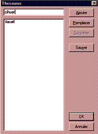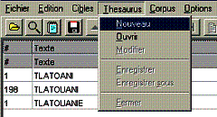 suffit de le faire une fois puis d'utiliser le thésaurus créé. Pour créer un Thésaurus il faut choisir cette option dans le menu principal puis <Nouveau> |