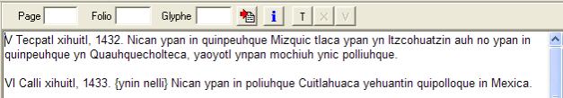 En la parte superior de los textos se encuentran algunos campos e iconos. Los campos llamados <Página>, <Folio> o <Glypho>